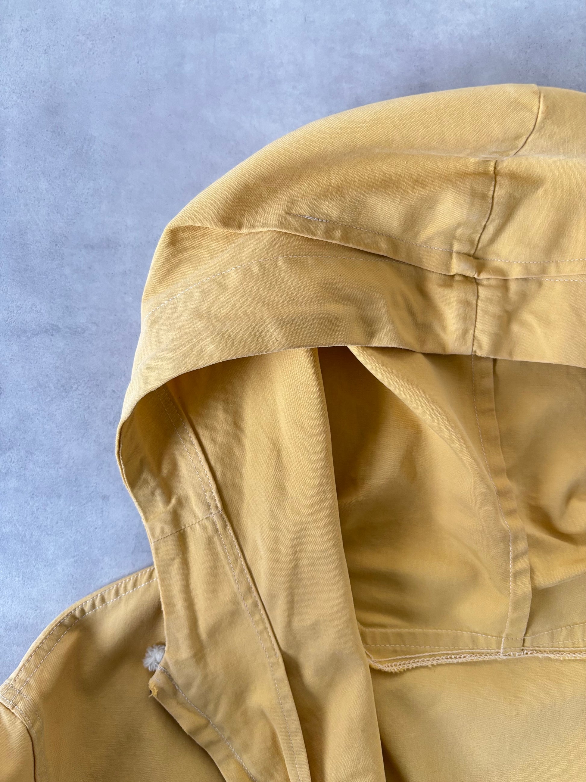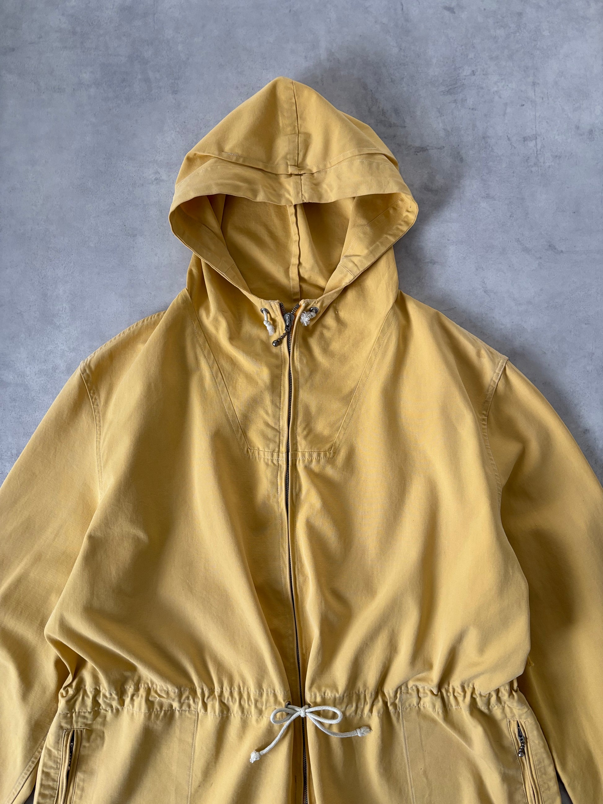 カラーは、柔らかく淡いイエロー。主張しすぎないトーンのため、淡いデニムなどとも相性が良く、スタイリングに自然と馴染みます。薄手の生地感も相まって、春先から秋口まで長いシーズンで活躍するライトアウターとして重宝する一着です。